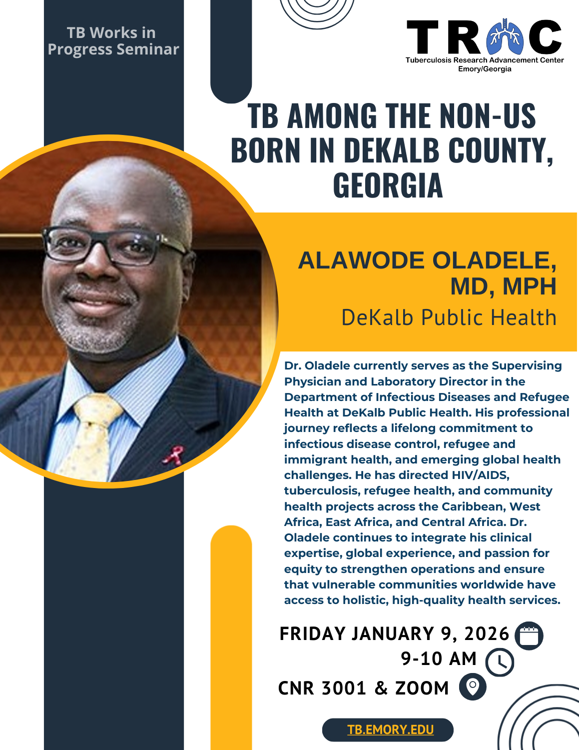 Alawode Oladele, MPH, PhD, Supervising Physician and Laboratory Director in the Department of Infectious Diseases and Refugee Health, DeKalb Public Health "TB among the non-US Born in DeKalb County, Georgia". January 9, 2026, 9-10am EST. Emory Rollins School of Public Health, CNR 3001 and via Zoom [Download Flyer | Add to calendar]